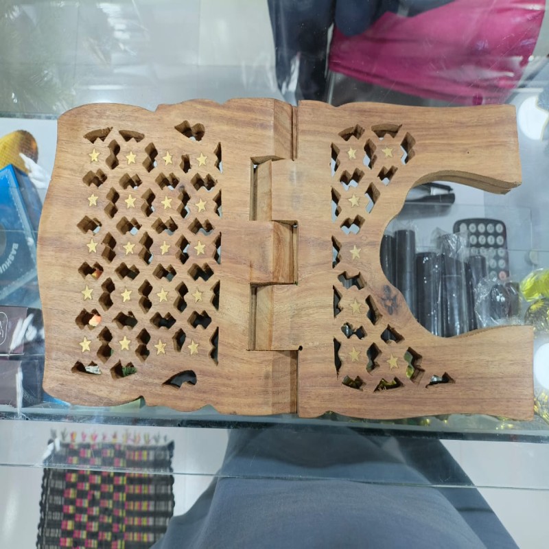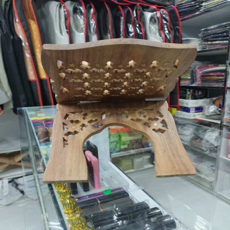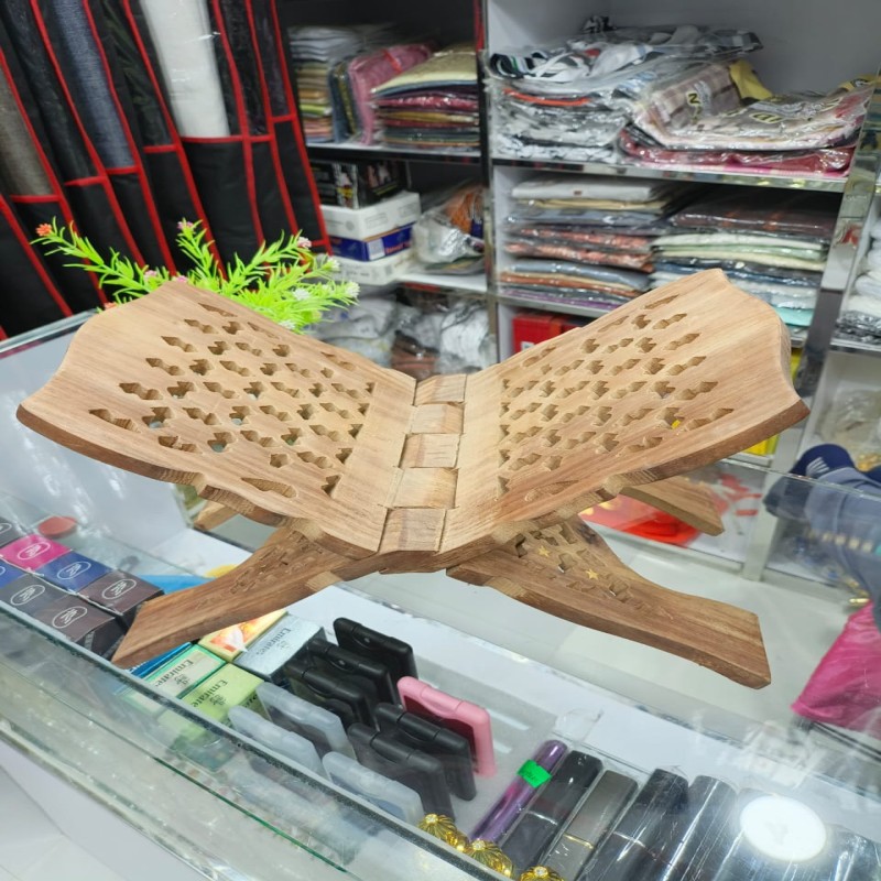 এই পবিত্র বইয়ের স্ট্যান্ডে আপনি পবিত্র কুরআন রাখতে পারেন। বইগুলি একটি উঁচু প্ল্যাটফর্মে রাখা হয় এবং একটি আধা-খোলা পৃষ্ঠের উপর রাখা হয়। এই কাঠের কুরআন স্ট্যান্ডটি ব্যবহার না করার সময় ভাঁজ করে দূরে রাখা যেতে পারে।